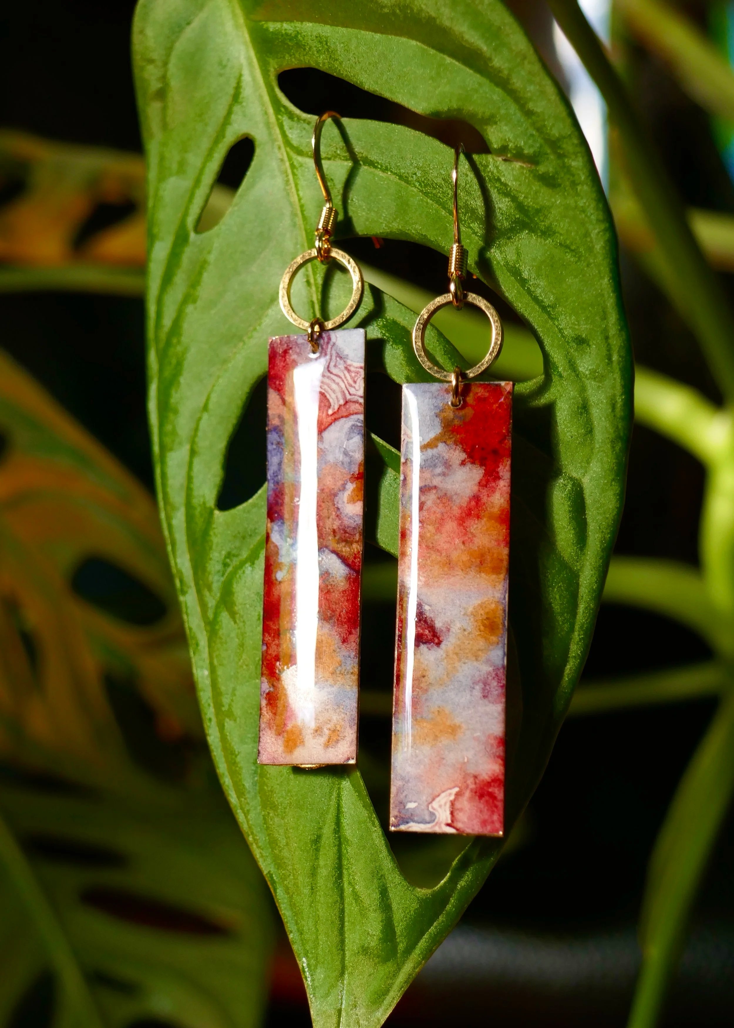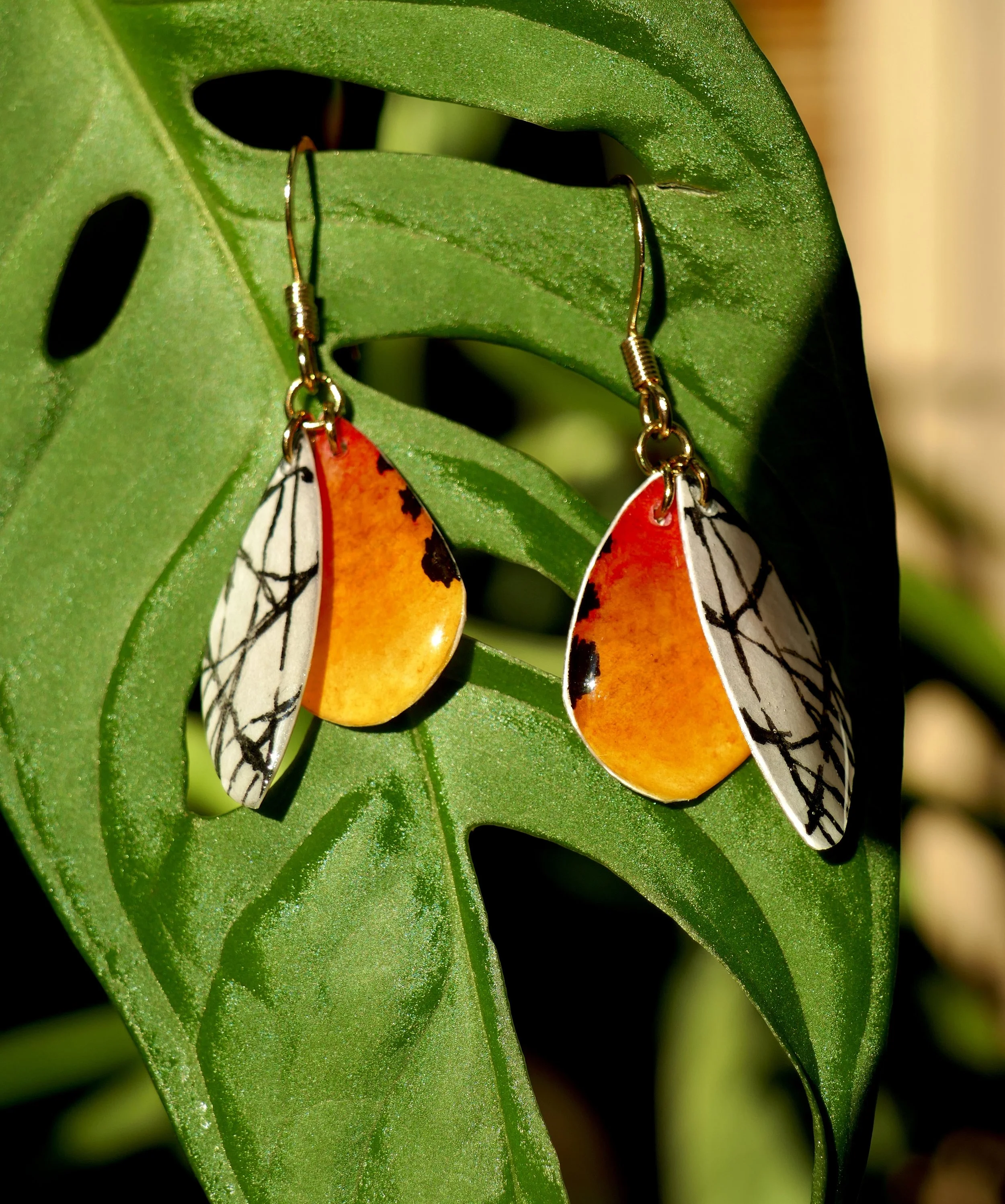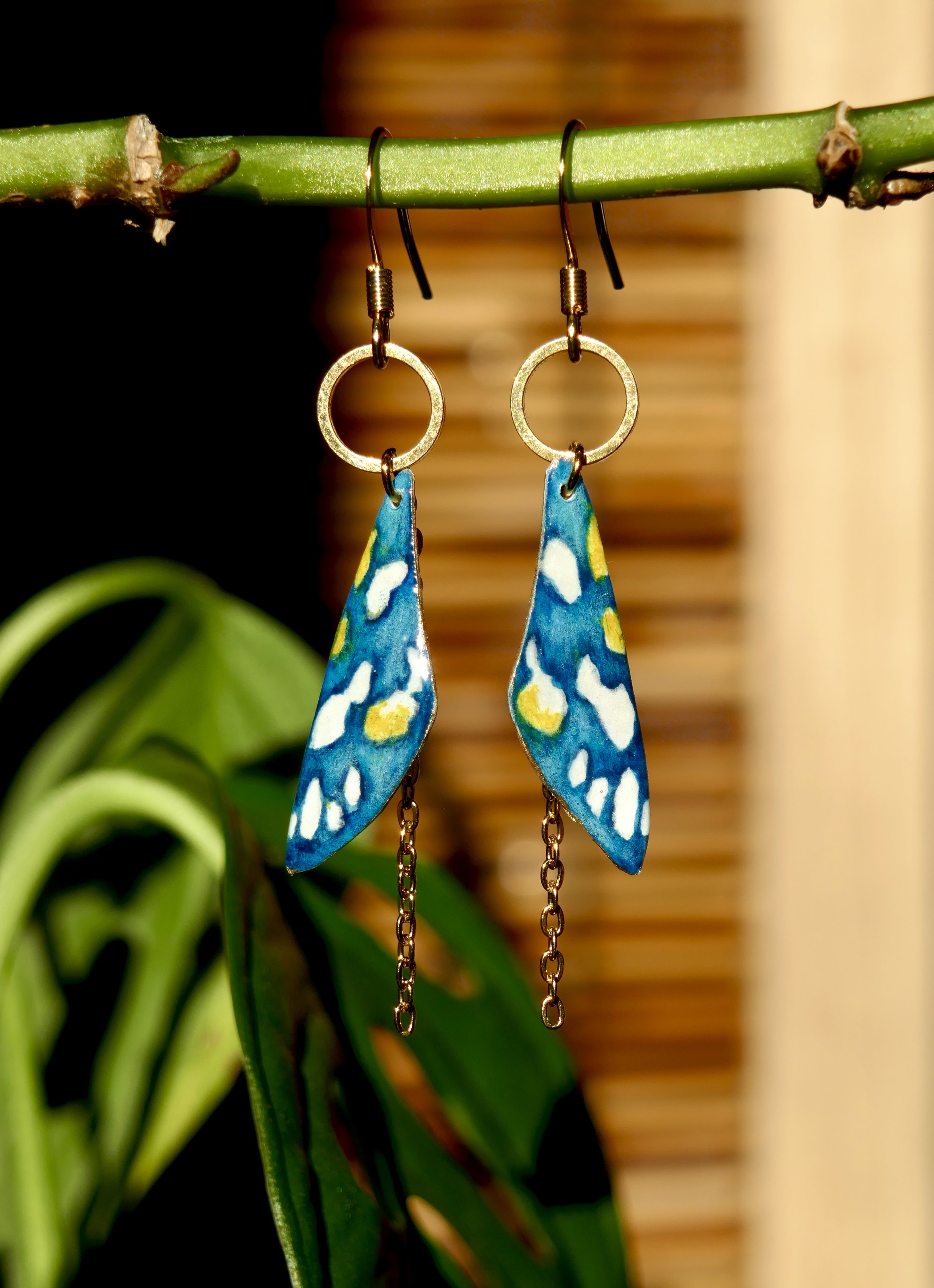 Tous les bijoux sont des modèles uniques, peints à la main à l’aquarelle et retravaillés au crayon et à l’encre. Les attaches sont en acier inoxydable, ce qui leur garantie une bonne durée dans le temps, ainsi qu’une diminution du risque d’allergie. Les perles utilisées sont en pierre naturelle ou en verre.